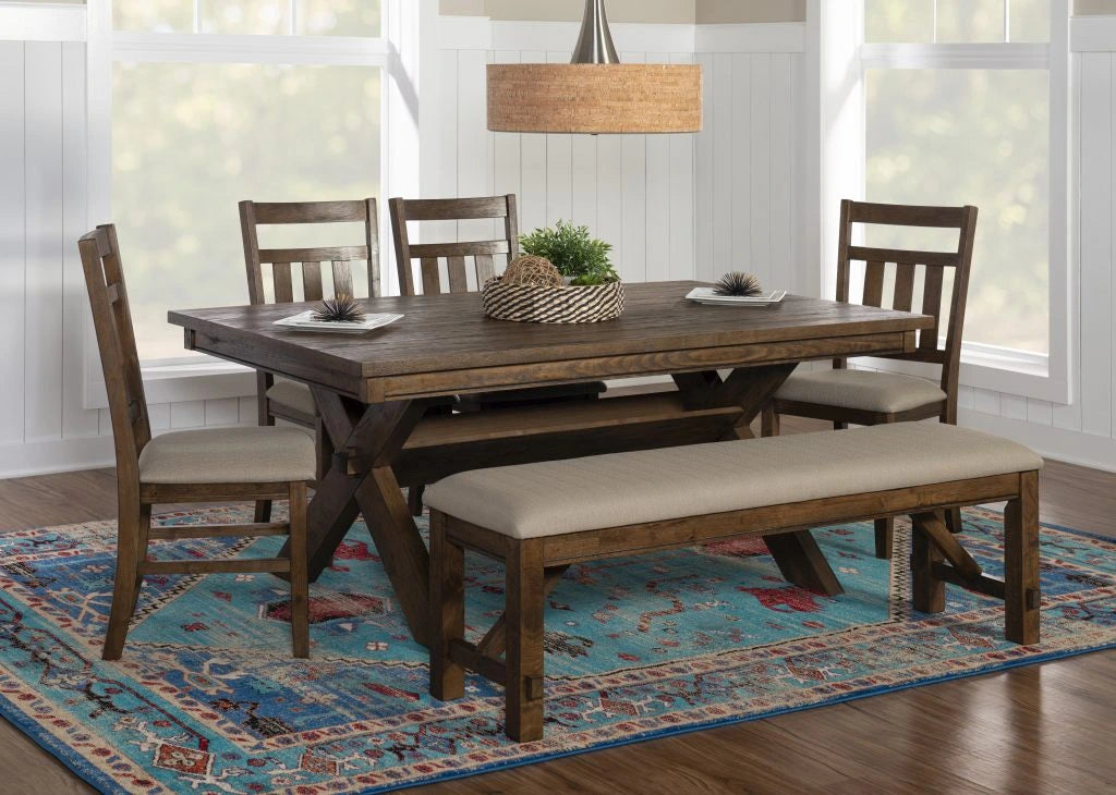 Outfit your dining room with the perfect Powell Turino 5-piece set, ready to fit any large family. This gorgeous collection has a rustic umber finish and neutral tan fabric. Set overtop an x-based frame, its spacious tabletop offers ample food and elbow room to accommodate both large and small dinners. It has a durable rubberwood, MDF and Ash veneer construction that delivers an updated farmhouse vibe. You will feel right at home when you’re gathering with family and friends around this comfortable set.