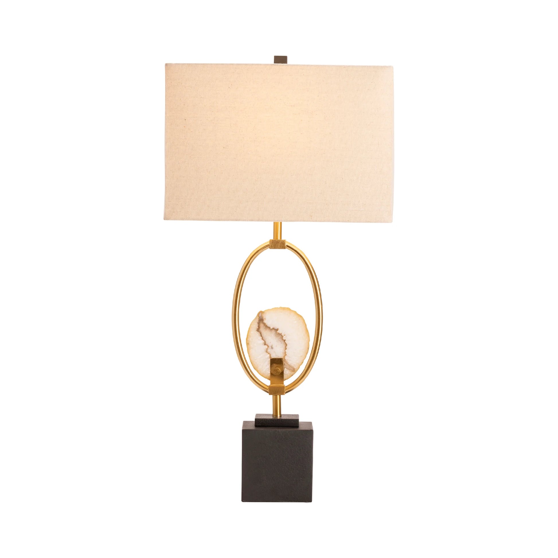 Rockhounds have found their illumination in the Agate Table Lamp. The base is crafted with a stylish marble finish for stability and heft in a dark rectangular pillar. Above this base sits the showpiece brass metal oval mount for a slice of agate, translucent and modern for your favorite space. A rectangular tan fabric lamp shade adds serenity to the look.
