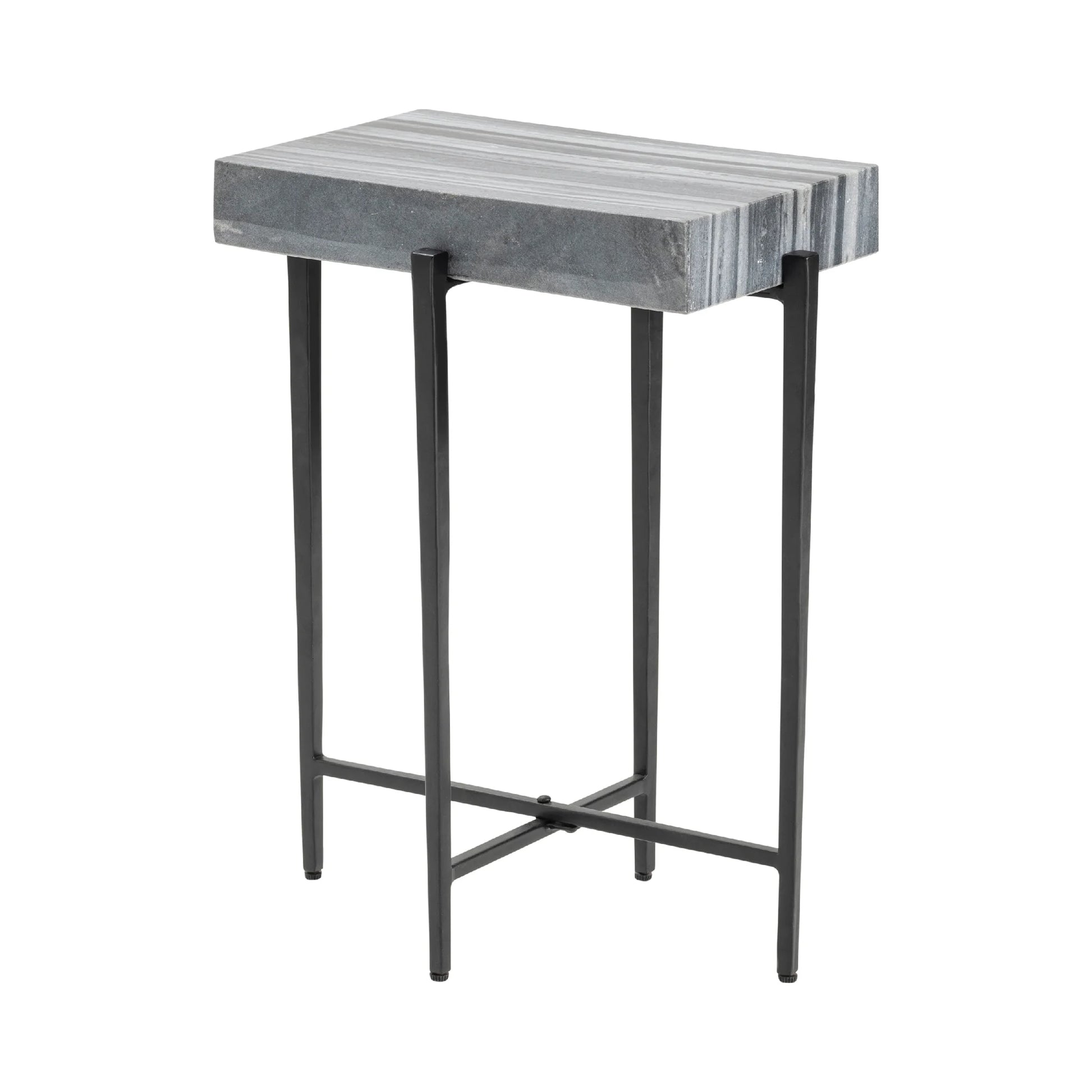 The Bailey Marble Block Accent Table a substantial, rectangular, medium gray block of marble sits atop a black base that holds the block securely in its prongs. The natural marble is cut to reveal the side-by-side layering of this exquisite stone. Perfect next to a chair for a small lamp or as a stand alone piece in any room you wish to make a statement in.