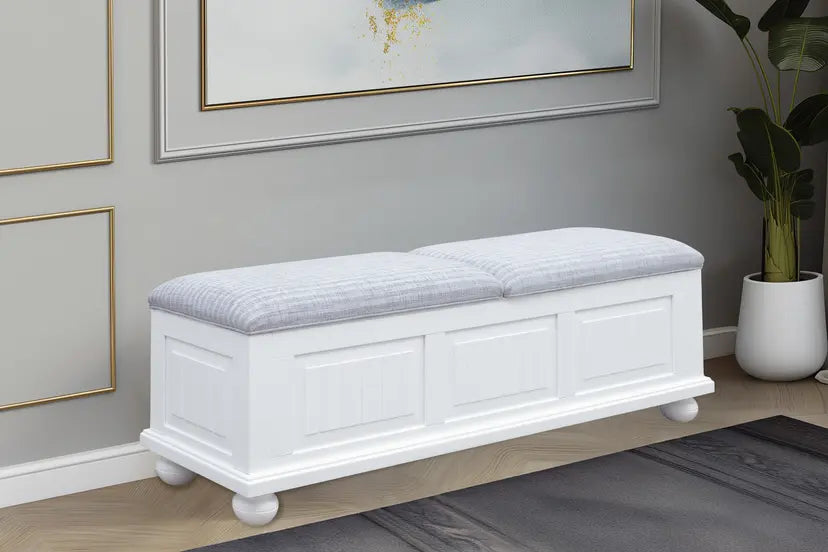 The Beachfront Storage Bench can be used as a beautiful accent piece in any room providing added seating, with storage, to any space. Hand-crafted and finished, this bench comes with two seat cushions for extra comfort. Its hinged top lifts open offering ample space to store your blankets, toys, books or a wide variety of items.
