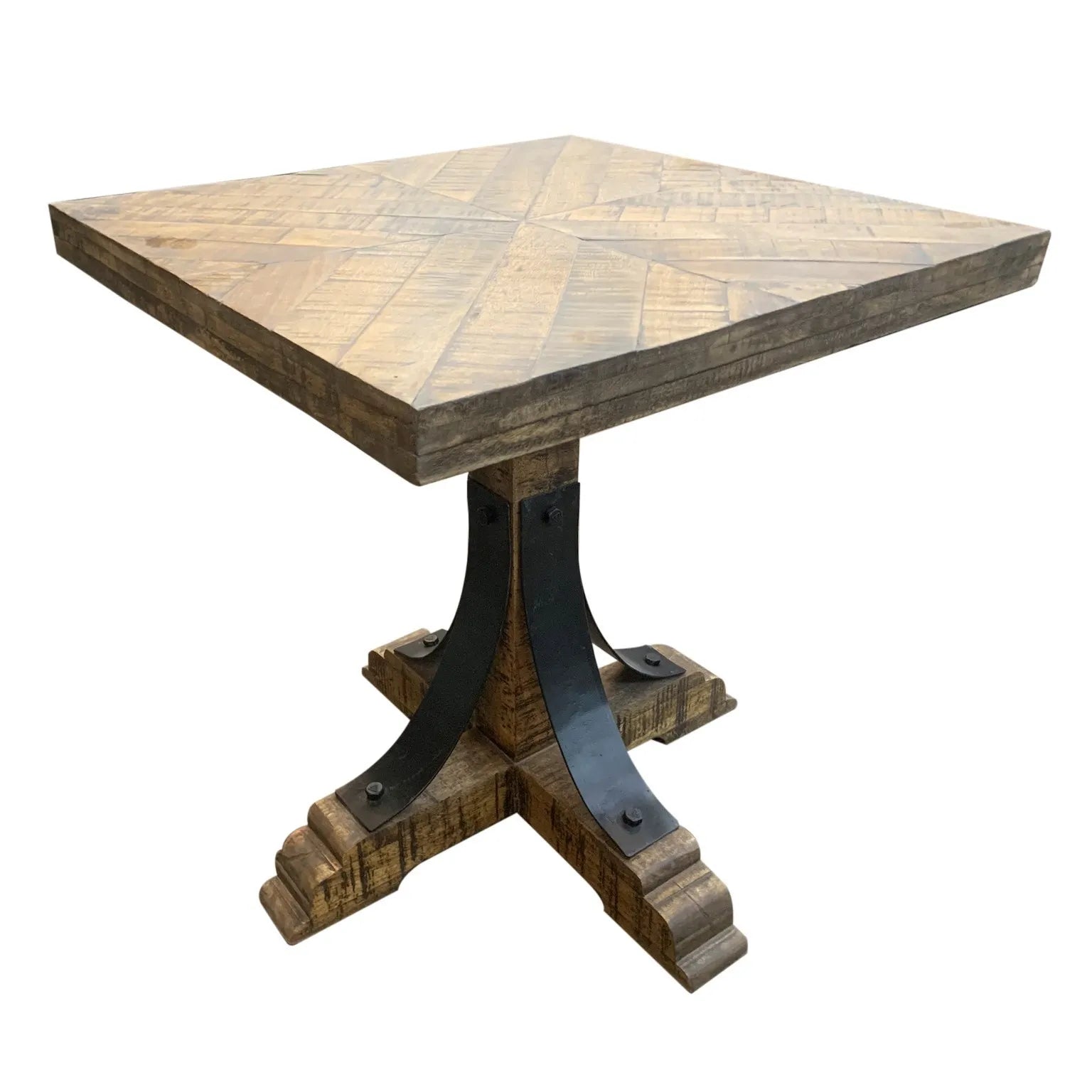 The Bengal Manor Iron Trestle Base End Table has a classic, rustic look that will bring a cozy feel to your home. A trestle base supports a square table top that is ideal for supporting a lamp or plant. Each side of the medium-brown wooden base has a black metal arc to accent the piece. The table top has a perpendicular stripe design that enhances the rustic look.