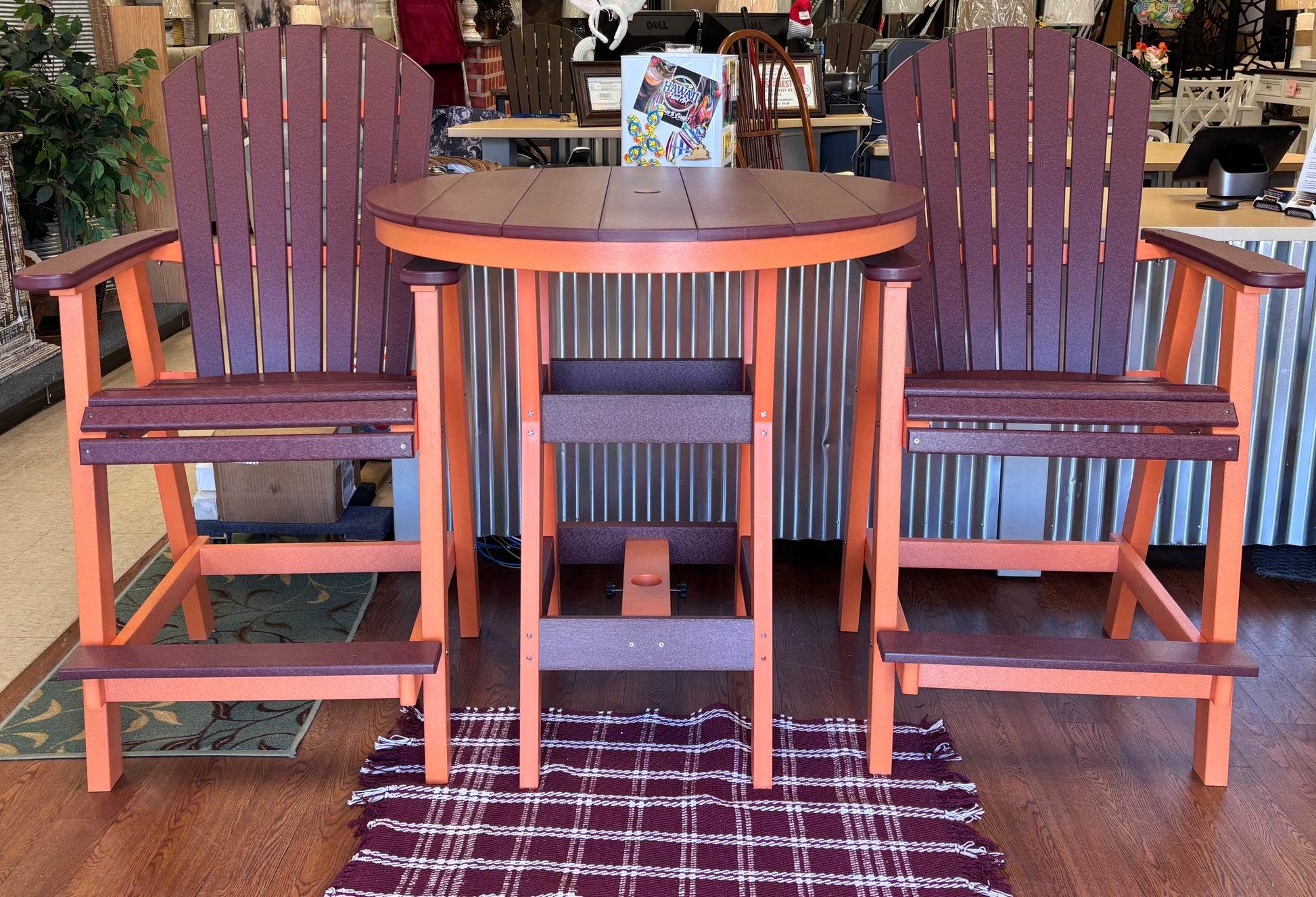 Tables come with umbrella holes. 20 year RESIDENTIAL USE warranty. 5 year COMMERCIAL USE warranty.