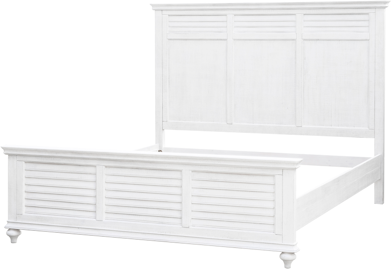 The Brockton Panel Bed is hand-crafted from solid wood with a slightly distressed white finish. Hand-placed shutters in the three inset panels on the headboard and footboard, lend to its casual yet elegant unique design.