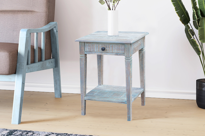Artfully hand-crafted with color, character and charm, the Dover Chairside Table in Light Blue Multi-tones, is hand-crafted with subtle details and a distressed finish. Built with lean, tapered legs, a small top drawer and an open shelf on the bottom, you will love its functionality and design.