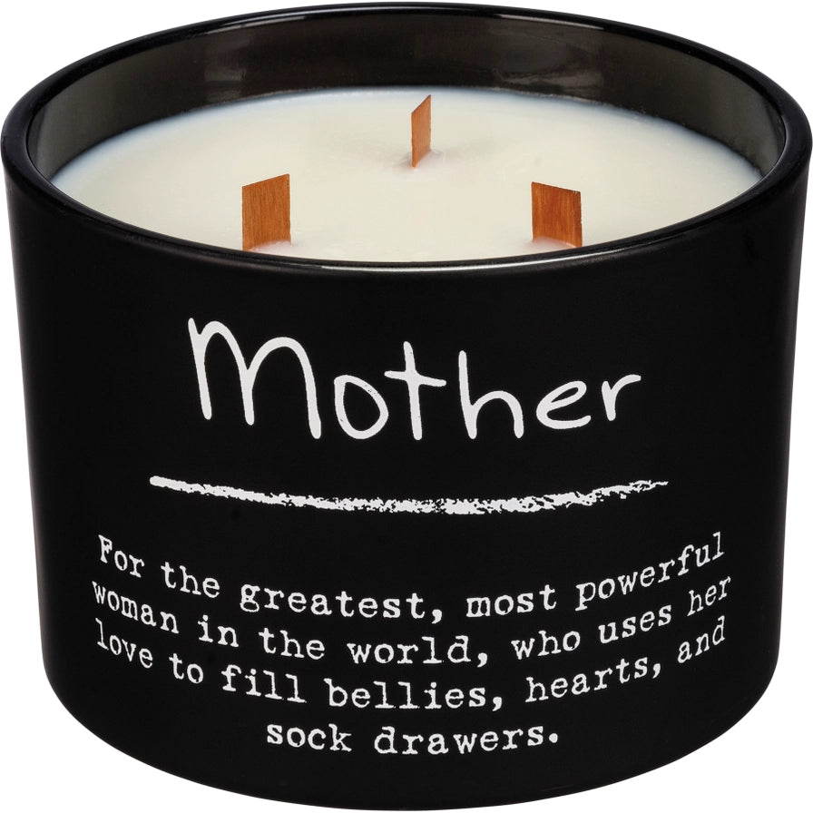 A matte black glass vessel holds this soy-based wax candle from our Poetry Collection which features a refreshing lavender scent and "Mother For The Greatest, Most Powerful Woman In The World, Who Uses Her Love To Fill Bellies, Hearts, And Sock Drawers." sentiment. The smart sentiment on the front makes this item a perfect and easy gift that feels tailor-made for the mothers in your life. This Mother candle contains three wooden wicks for a total of 26 hours of burn time. Includes a plastic wax cover for protection and a polished look.
