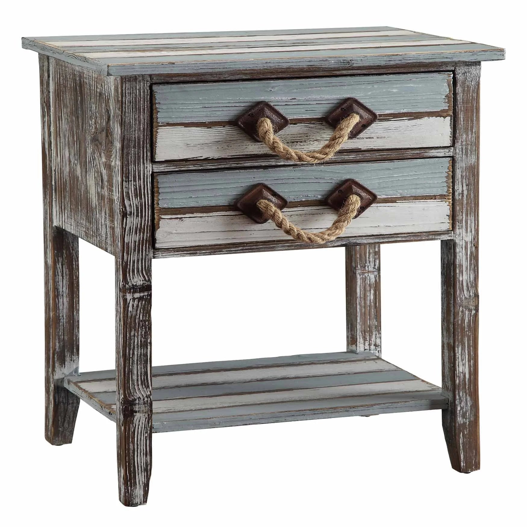 It won't take long to love this Nantucket 2-drawer Weathered Wood Accent Table. Love it for the look of weathered pine wood finishes in light gray, blue, and white striping across the tabletop, or love it for the two drawers to store your keepsakes (or phone chargers). Rope drawer pulls add to the nautical style. There's even a lower shelf for a few books or a framed photo.