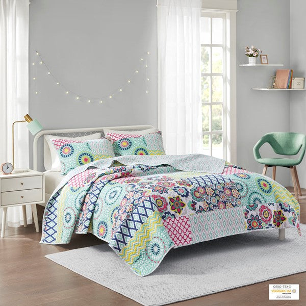 Add a splash of color to your bedroom decor with the Intelligent Design Sunny Printed Reversible Cotton Coverlet Set. Patchwork floral scarf and geometric prints in brilliant colors adorns the face of the cotton coverlet and an aqua ikat print on the reverse, for a stunning modern look. Two matching shams (1 for Twin/Twin XL) pair beautifully with the reversible coverlet, while hypoallergenic polyester filling provides exceptional warmth and comfort. With its vibrant contemporary charm, this reversible cotton coverlet set is machine washable for easy care. This bedding set is OEKO-TEX certified, meaning it does not contain any harmful substances or chemicals, and uses an antimicrobial treatment that provides built-in freshness protection, reducing the growth of odor causing bacteria to keep fabric lasting longer.