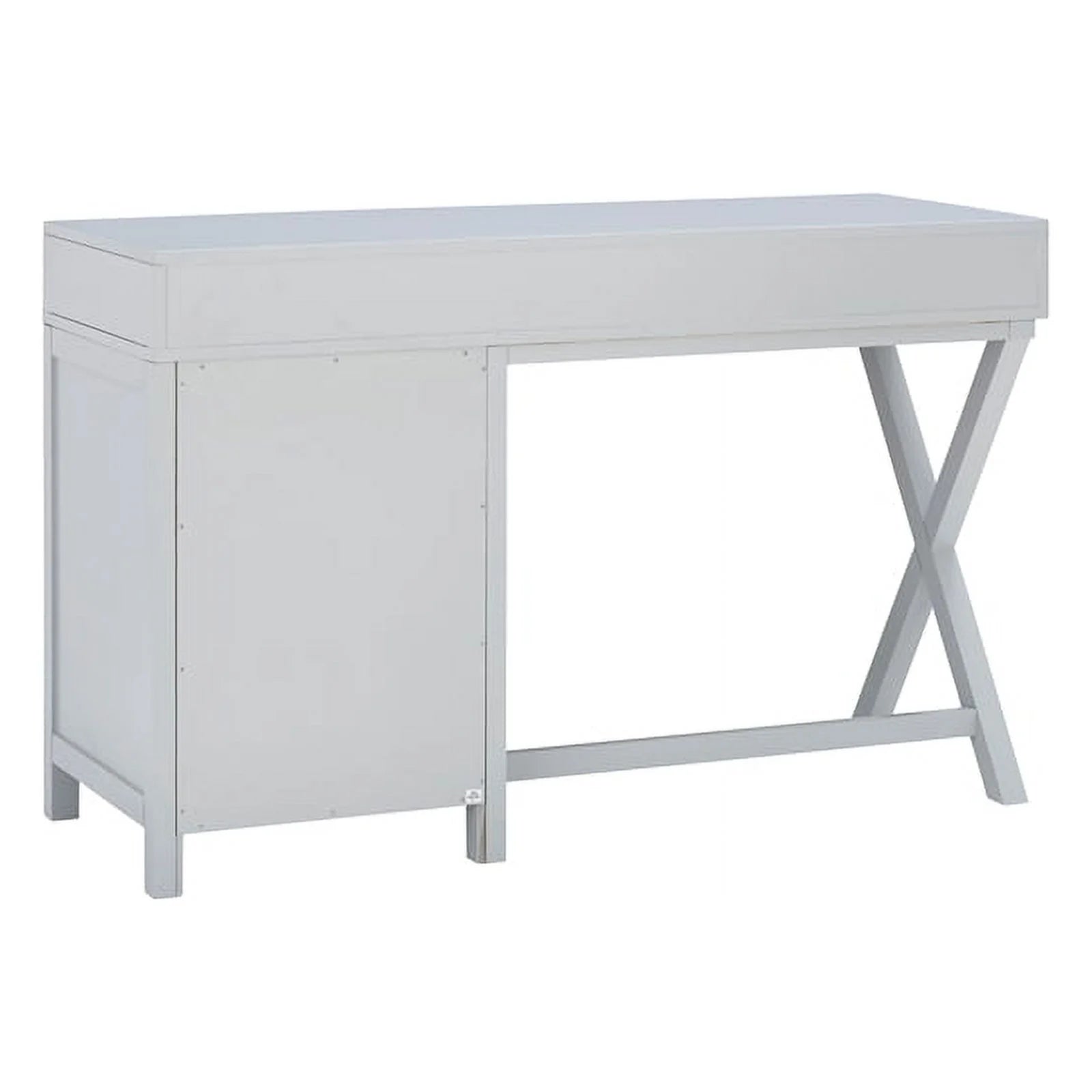 Gain new levels of control over your productivity and organization with this sleek desk and storage combination. The 48” x 18” design provides an ample workspace without overcrowding your home office or bedroom. 3 drawers and a larger storage drawer seamlessly tucked under the desk and equipped with shiny silver metal handles. The modern grey finish pairs well with today’s cutting edge decor, but is subtle enough to blend with almost any other setting.