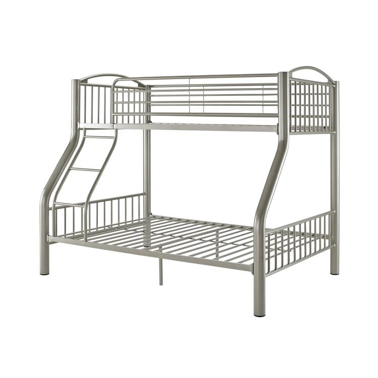 This Twin Over Full Bunk Bed is made to withstand all of the adventures and pressures of a youth environment. Crafted of Pewter finished Metal, this piece easily complements the ever changing décor of a childs room. Two beds in the space of one, this piece features a twin size bed above a full size bed. A stylish yet sturdy step ladder provides easy up and down access to the top bunk. Some assembly required.