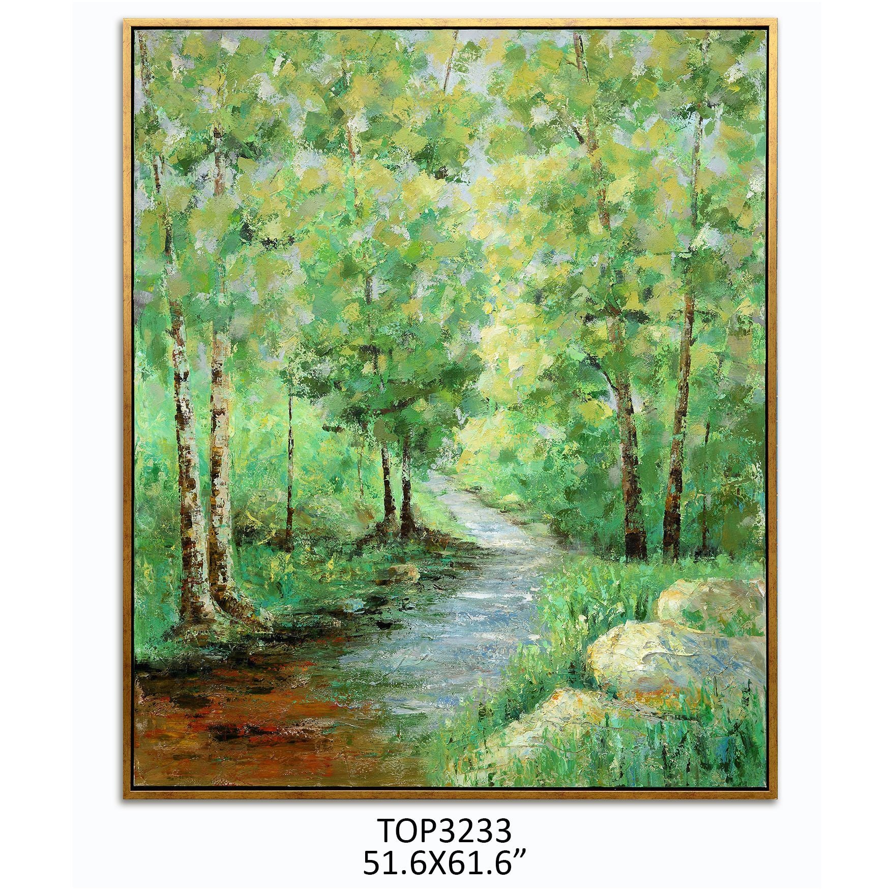 This painting captures the essence of nature's beauty, with its vibrant colors of greens and blues that represent the lush trees and sparkling water. Crafted on high-quality canvas material, this painting boasts intricate details of the trees and the flowing water, creating a sense of depth and dimension that brings the beauty of nature into your living room, dining room, or bedroom. The heavy paint adds a beautiful and unique texture that enhances the overall design. The painting is framed in a beautiful antique gold frame, adding a touch of elegance and sophistication to the overall design.