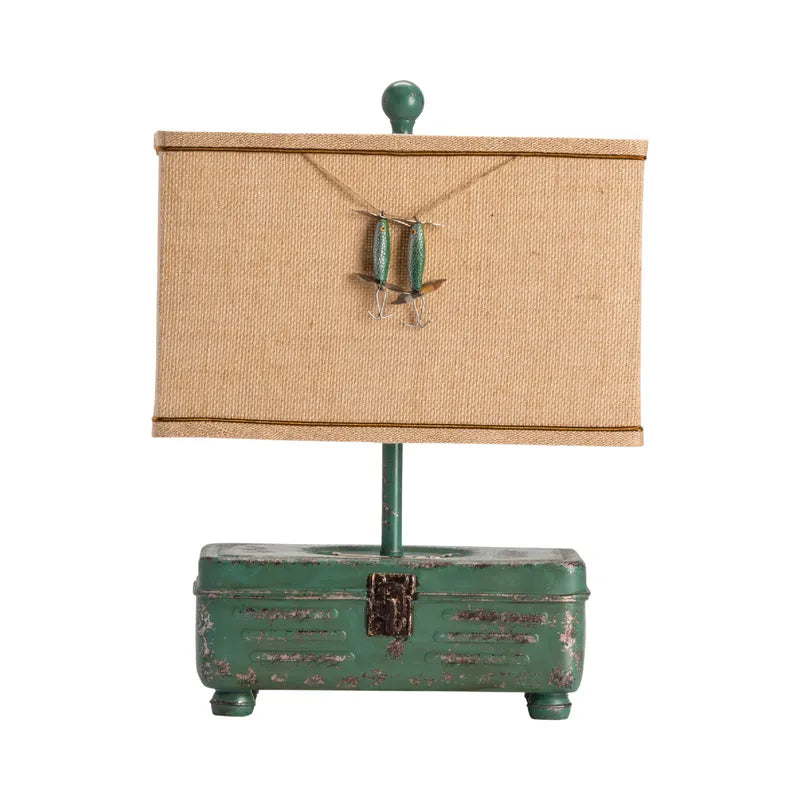 This charming design showcases a polyresin, traditional tackle box in an antique, dark green finish. Adding to its delight is a square burlap shade with dark red trim details and features a decorative fishing lure accent.