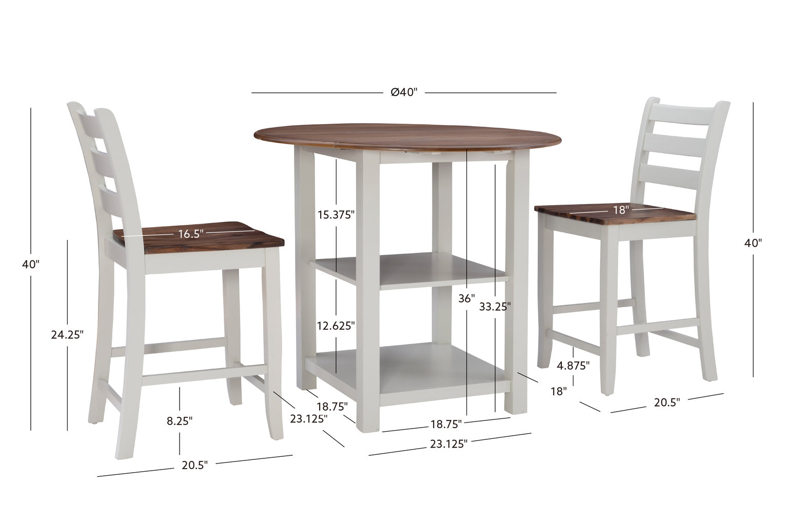 Infuse a modern farmhouse look into your home with this 3 piece counter height dining set. Acacia wood veneers in a warm brown finish are wire brushed for added texture and emphasis on the beauty of the natural wood grain. In the support role, light grey hardwood frames provide a sturdy foundation while also creating a two tone finish that pairs seamlessly with a variety of decor settings. The table top features an ogee edge and drop leaves that can be positioned to add extra surface space when prepping a meal or entertaining guests. Two lower shelves offer open storage options and round out this multifaceted dining solution.