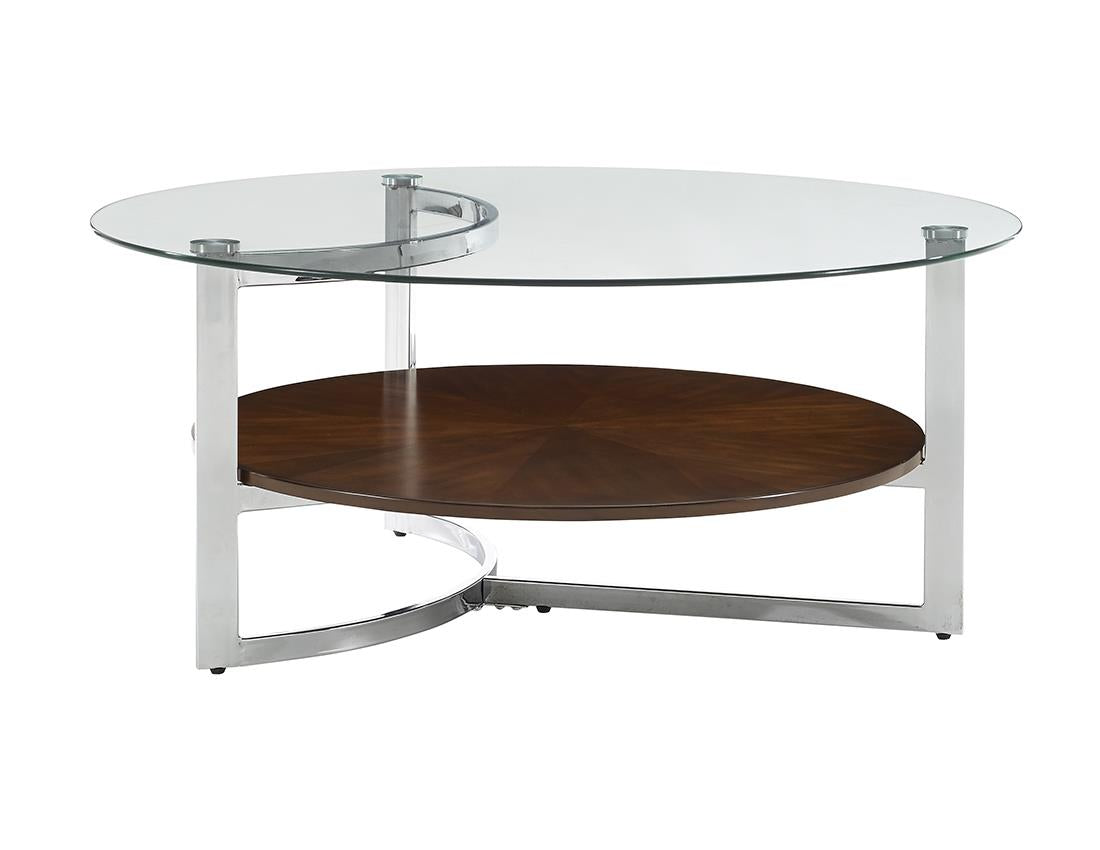 Sleek and contemporary mixed media occasional tables. Tables feature birch veneer shelves; chrome finish metal bases, and glass tops. Wood shelf is finished in a medium brown finish.