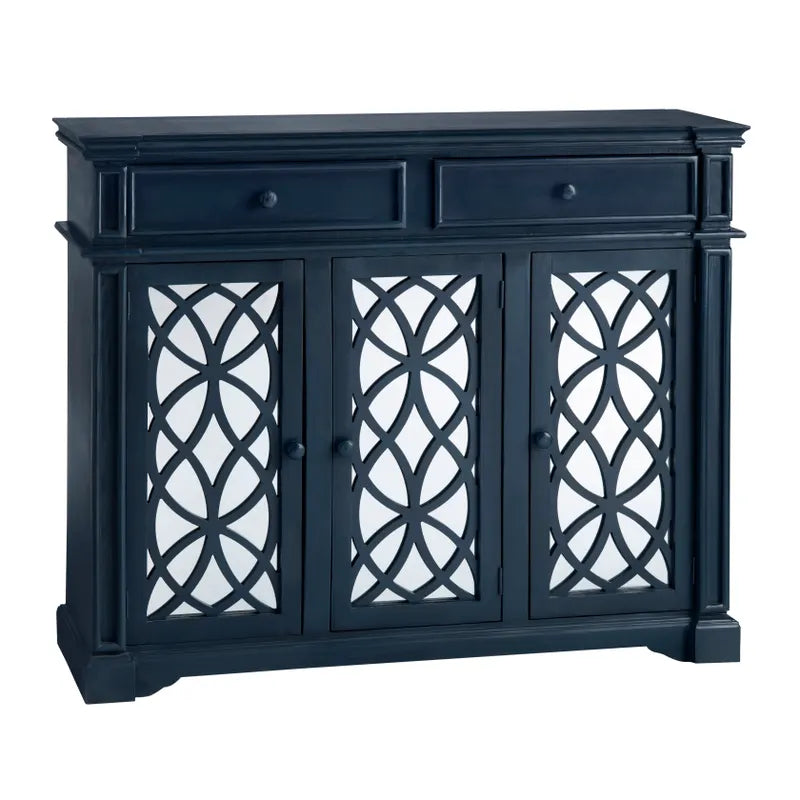 The Verona Two-Drawer Three-Drawer Sideboard is the perfect blend of traditional charm and modern elegance. Crafted from premium pine wood and painted in a rich blue shade, it is sure to brighten up any living space. This sideboard truly stands out thanks to its distinctive design, showcasing striking geometric patterns on the doors, and the incorporation of mirrors on each door that not only reflect light but also create an illusion of spaciousness.