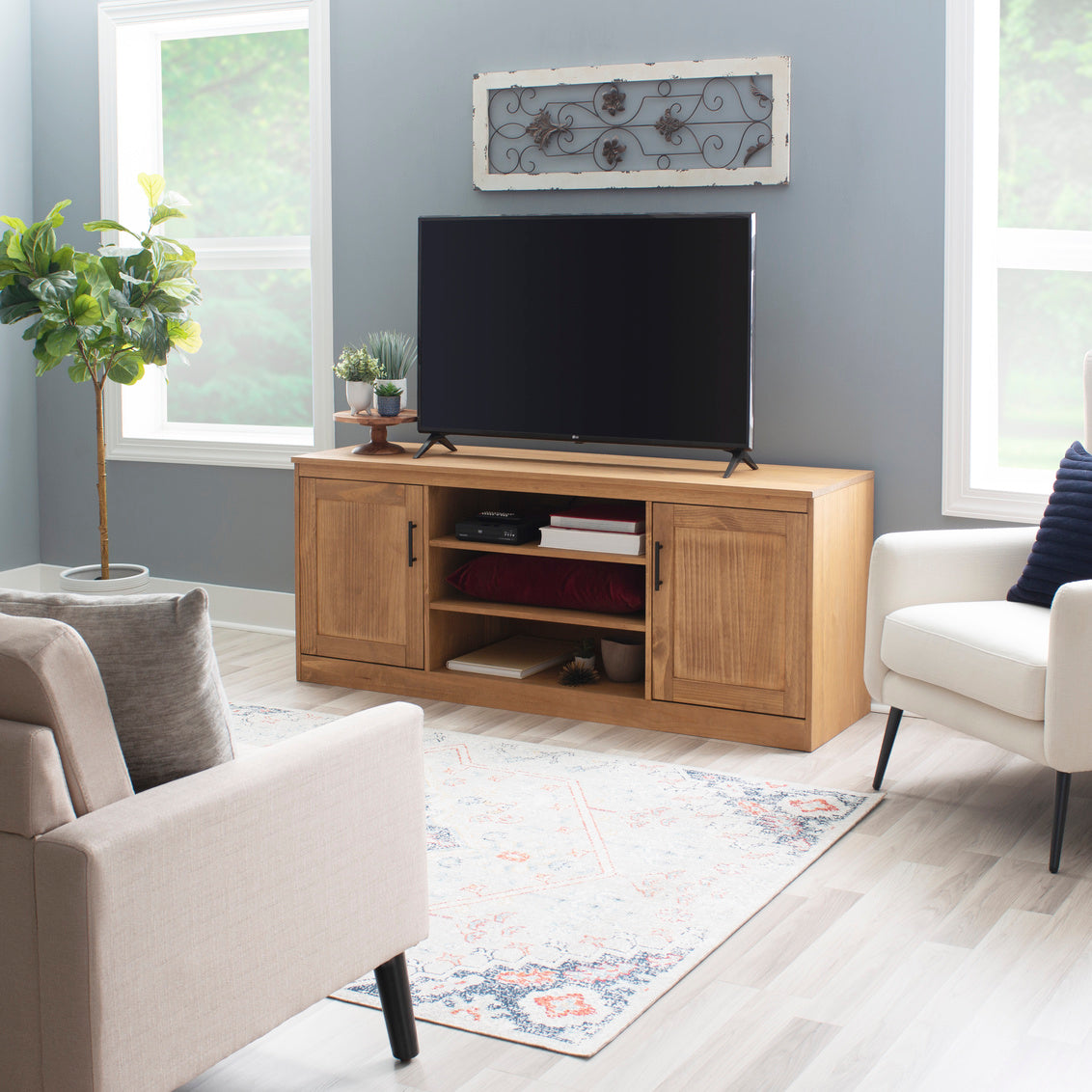 This rustic tv stand serves as the perfect base for your family entertainment space while also catering to a modern farmhouse or coastal aesthetic. Two side doors open to reveal adjustable shelves, while the open facing platforms in the center are perfect for placing consoles or displaying memorabilia. Constructed of solid brazilian pine, the frame is covered in a matte maple finish and surface treatment wax for added shine and protection.