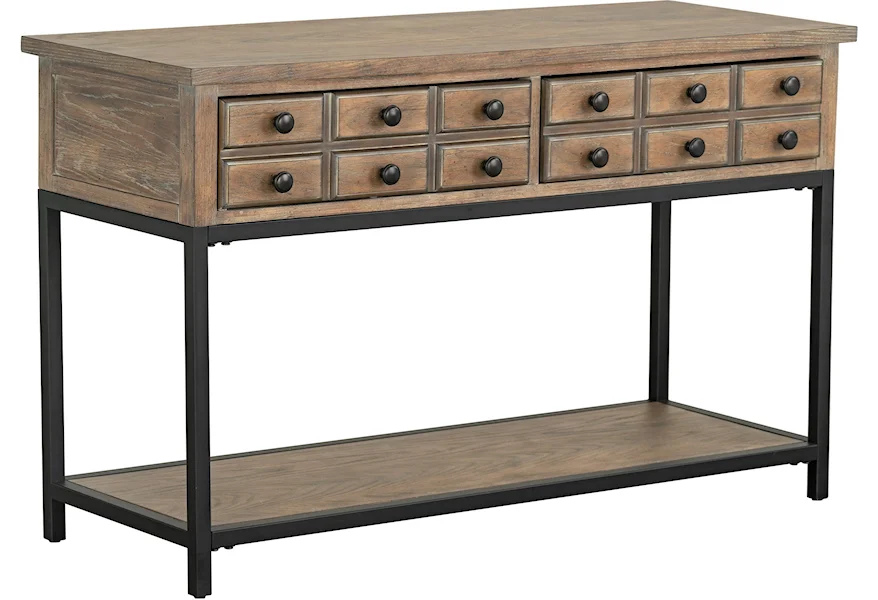 Complete your transitional style living room with this weathered finish sofa table. Featuring knob pull handles for visual appeal, the two drawers and bottom shelf offer plenty of storage space to help keep your table top clutter free. The metal base keeps this piece from feeling too heavy, making it great for small or large spaces.