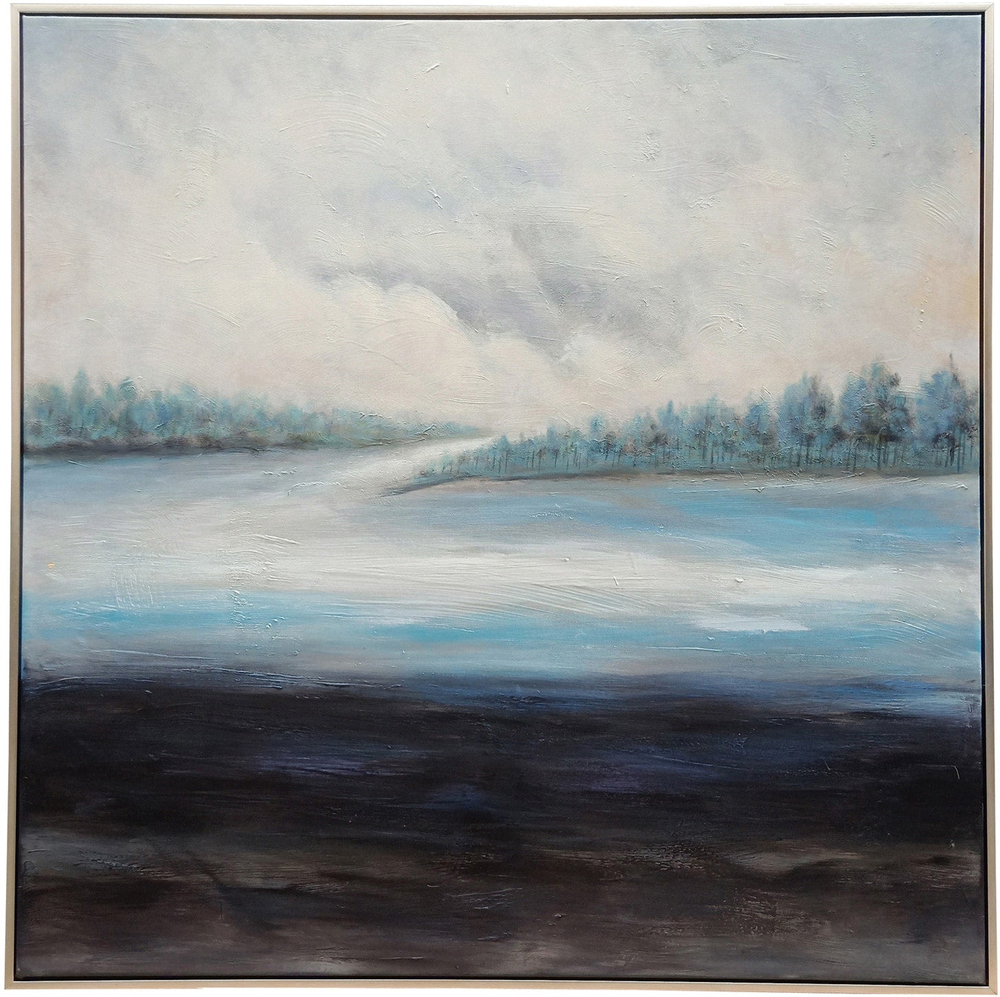 The "Wellton" Canvas Painting features a look by the lake. Wth tones of blue, brown, and tan. This elegant hand painted transitional artwork shines, and has you feeling like it's winter. Measuring at 40-inches x 1.5-inches x 40-inches. This painting is sure to be conversation piece in your home.