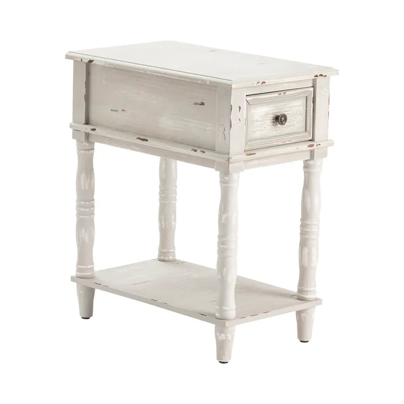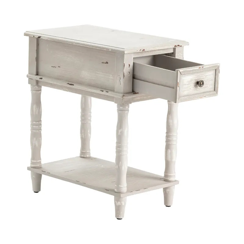 This table is a pro at holding your favorite lamp, books, or nighttime accessories. Bring this Weston Chalk gray 1-drawer Chairside home soon. The table brings a softly distressed white fir wood finish to your home, with additional shelf storage below and a convenient drawer. The spindle-shaped legs give the whole piece traditional style and add a classic feel to your home.